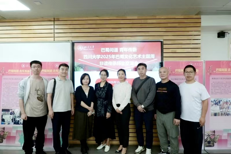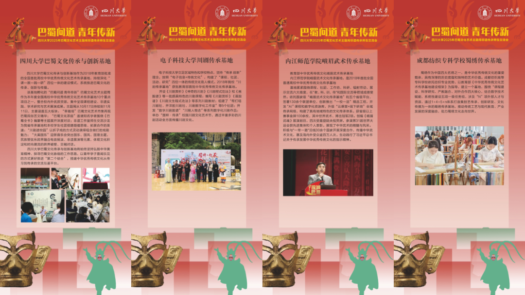 2025年10月18日下午,“巴蜀问道 青年传新”四川大学2025年巴蜀文化艺术主题周非遗传承师生交流会,在望江校区基础教学楼顺利召开。本次交流会邀请到电子科技大学川剧传承基地、内江师范学院峨眉武术文化传承基地、成都纺织高等专科学校蜀绣传承基地相关负责同志到校,与四川大学巴蜀文化传承与创新基地师生和校内相关主题学生社团同学进行分享经验,为中华优秀传统文化弘扬、传播和传承搭建起校际间、师生间的交流平台。