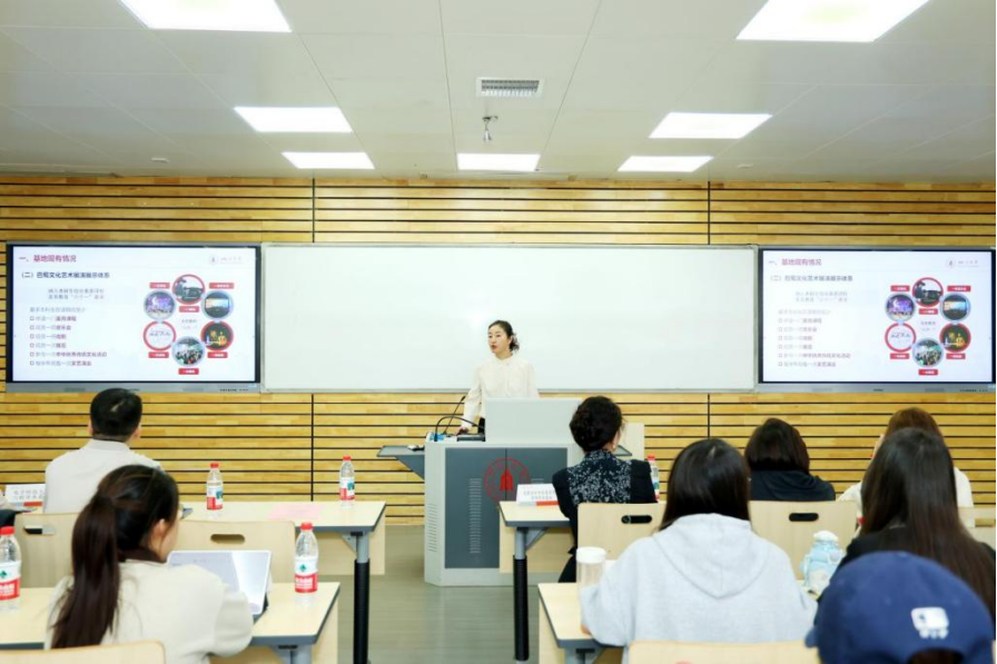 四川大学党委学生工作部副部长黄菲娅就学校巴蜀文化传承与创新基地建设情况进行介绍。我校基地由学校学生思想政治教育工作指导委员会统筹,学校美育工作办公室持续推进,构建了“课-展-践-研”一体化工作模式。目前已形成以国家一流课程《巴蜀文化》为核心的线下线上课程群,建设了成都彩灯传承、皮革与蜀绣交叉创新等3个非遗传承工坊,打造了“巴蜀问道”巴蜀文化艺术主题周品牌活动,孵化了一批聚焦巴蜀文化艺术的原创视听文创作品和学生大创项目、美育实践案例。
