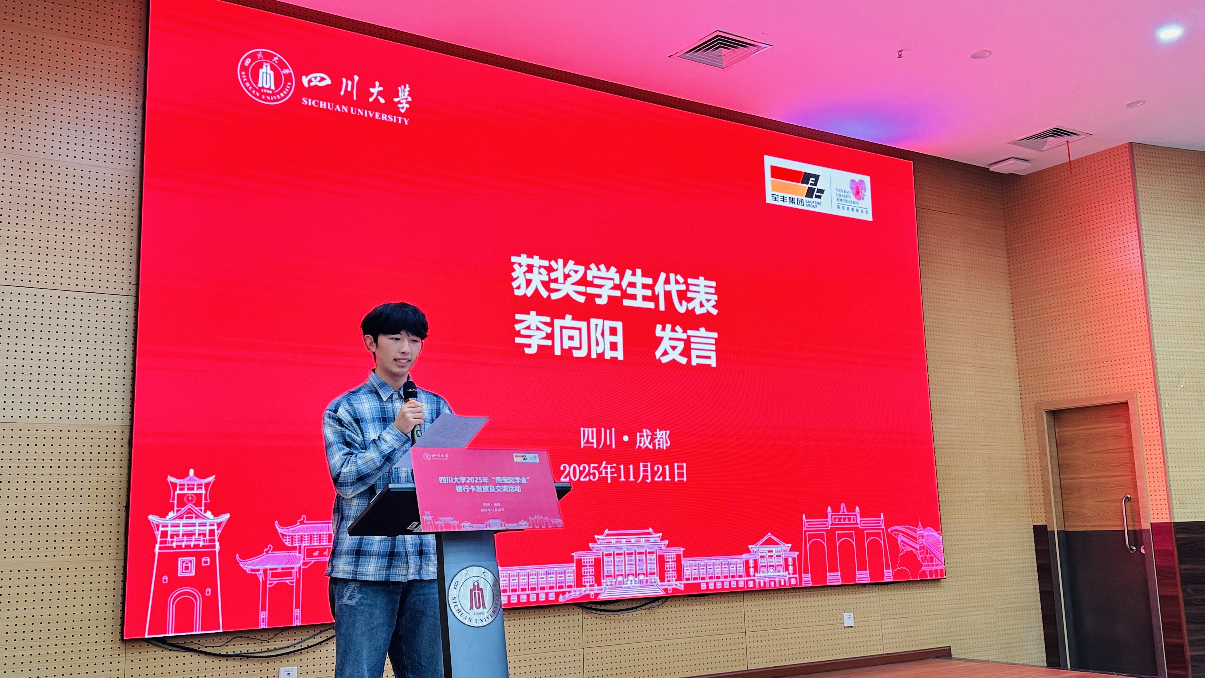 “从黄河岸到锦江边,山海阻隔不了燕宝深情。”法学院2023级学生王彤彤作为获奖代表分享了燕宝奖学金带来的改变:不仅缓解了经济压力,更让她在志愿服务中领悟善行真谛。2025级少数民族学子李向阳则讲述了预科期间参与三星堆研学、映秀生命教育活动的收获,直言燕宝支持是前行路上的坚实后盾,未来将以奋斗姿态传递爱心火炬。
