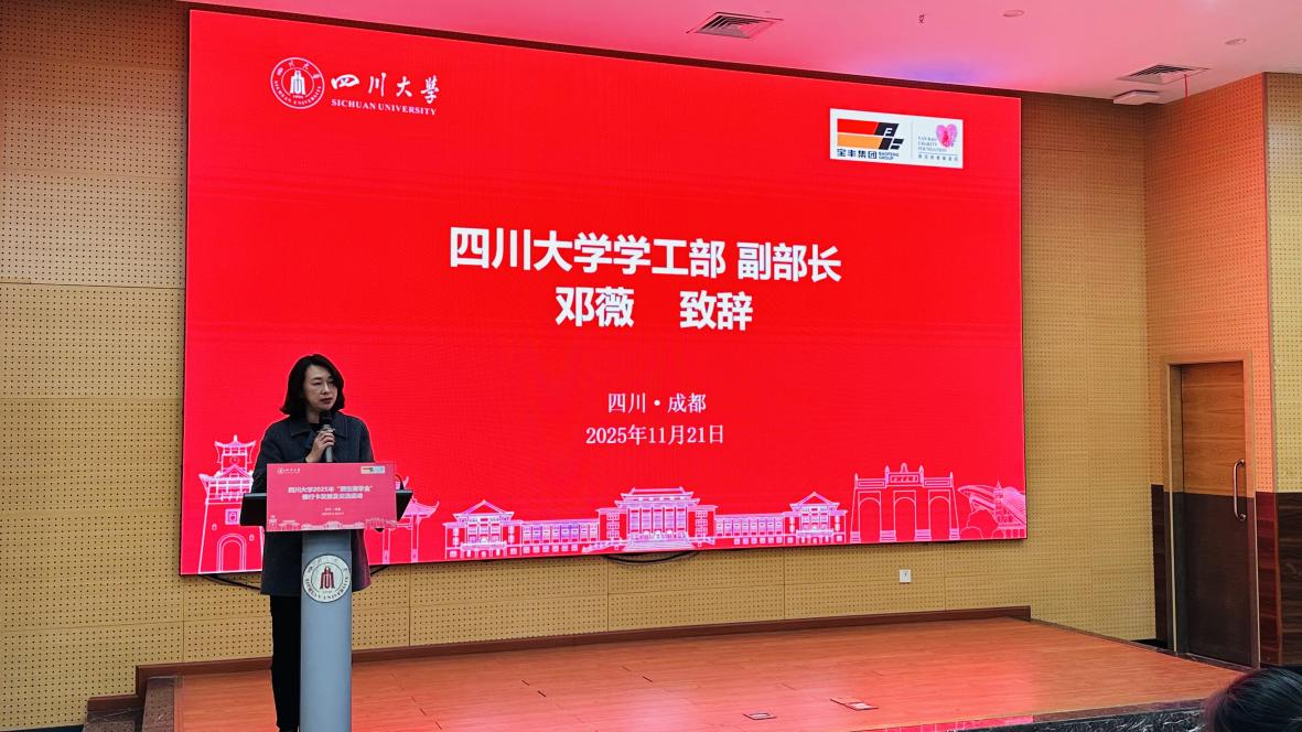学工部副部长邓薇在致辞中回望川大129年办学积淀,详解学校“保障-提升-引领”三位一体资助育人体系。她着重提及,燕宝慈善基金会今年在我校增加捐资100万元设立奖学金,惠及50名本科生与50名研究生,这份关爱向全体川大学子传递了奋进力量,彰显了企业“践行社会责任、创造社会价值”的使命担当与家国情怀。