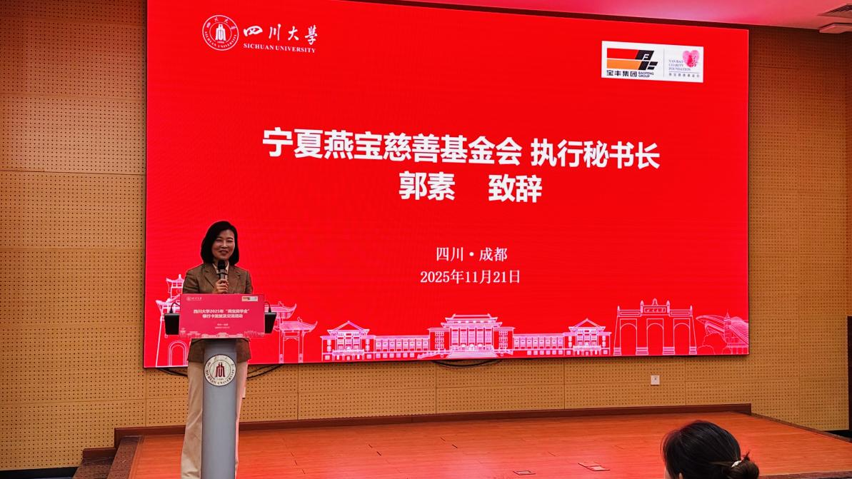 “十五年公益坚守,四十余亿爱心倾注,三十万学子圆梦。”燕宝慈善基金会秘书长郭素深情分享基金会的公益初心。依托宁夏宝丰集团年利润持续注入爱心动能,基金会累计投入善款44.03亿元,助力38.63万名西部学子圆梦学府,其中27.68万人已成长为社会中坚力量。她说,基金会无差别全覆盖的资助模式,如明灯照亮西部教育发展之路;与川大的深度合作,更是公益初心与教育使命的“双向奔赴”,期待未来深化协作,共同培育更多担当时代重任的青年人才。