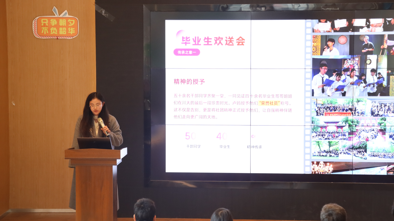 社庆尾声,学工部副部长卢希芬在总结发言中,以“自助者,天助之”为引,结合生动事例鼓励同学们把握机遇、勇敢前行,言语间满是对社员的牵挂与期许。她说,正是这份凝聚力与向心力,让自强社在岁月长河中不断焕发蓬勃生机,成为滋养青年成长的重要平台。