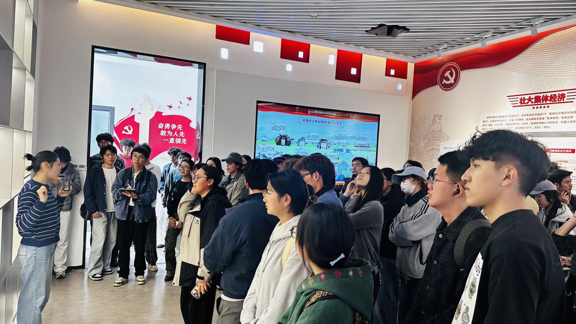 在特色产业展示中心,研学团见证了“农产+非遗+文旅”的融合发展新模式。当地特色农产品、手工美食与非遗产品的琳琅满目,生动诠释了“产业兴村、文化富民”的现实路径。在“壮大集体经济”主题展区,通过了解“集体持有、集体运营、按股分红”的核心模式,同学们直观看到了集体经济从改革突破到产业升级的完整逻辑,坚定了“扎根基层、服务群众”的青春志向。