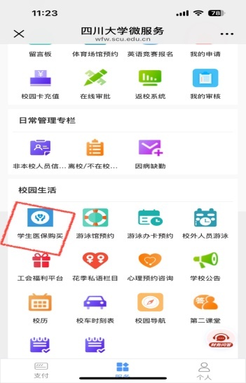 集中缴费方式1:微信搜索“四川大学健康管理”公众号,关注并点击右下角“公共服务”,在弹出菜单中选择进入“医保服务”模块,然后选择“医保购买”,根据提示激活帐号并修改完善个人信息,按步骤完成医保缴费即可;