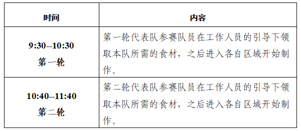 1.本次厨艺大赛由各院系参赛队伍自选菜品,要求在限时60分钟内制作具有家乡特色风味的菜品,食材需普遍易采购,菜品为炒、炸、蒸等热菜,凉菜不作为参赛菜品。后保部饮食中心将根据收集的参赛菜单,结合是否适合在食堂推广为要求,复核各院系推荐的参赛菜单,涉及重复的菜品将沟通调整。本次比赛由专业评委组和大众评委组现场打分评比,获奖参赛作品将纳入食堂菜品推广制作的考虑范围。以下为比赛时间安排表(每轮16组左右)。