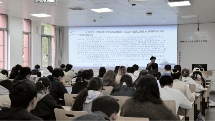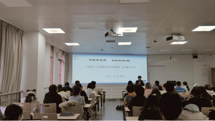 陈文泽教授以“绘就新蓝图,启航新征程”为题,围绕党的二十届四中全会精神作专题讲座。她带领同学们回顾了历届党的中央委员会全体会议的主要议程,重点阐释了党的二十届四中全会最重要的成果是审议通过了《中共中央关于制定国民经济和社会发展第十五个五年规划的建议》(以下简称《建议》)。她结合《建议》的起草过程,深入解读了其中体现的科学决策、民主决策和依法决策原则,展现了党内民主和全过程人民民主的生动实践。