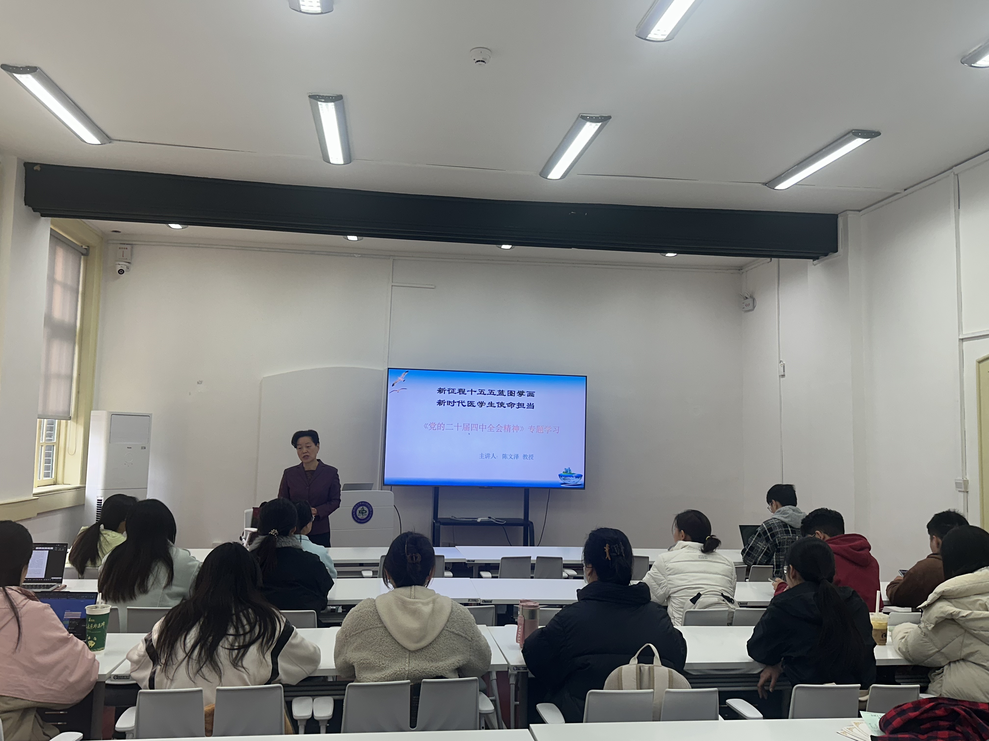 授课中,陈教授围绕全会核心要义,以及会议通过的《中共中央关于制定国民经济和社会发展的第十五个五年规划建议》中的“社会主义现代化”主旨作重点阐释。她简要介绍了历届五年规划的历史来由和制定方式,介绍了《建议》的起草过程中发扬党内民主和全过程人民民主的生动实践。随后,陈教授介绍了“十四五”的重大成就以及“十五五”的重要地位,以“中美关系”中的博弈为例,强调了“中华民族的伟大复兴”是不可逆转的这一坚定信念。她还结合专业特色,提到了《建议》中关于“健康中国”战略的建设部署(第十一条:加大保障和改善民生力度,扎实推进全体人民共同富裕),介绍了对口腔健康防护、公共卫生干预等领域的战略支持,强调口腔医学的精准诊疗与预防医学的关口前移相辅相成,是筑牢全民健康防线的重要支撑。