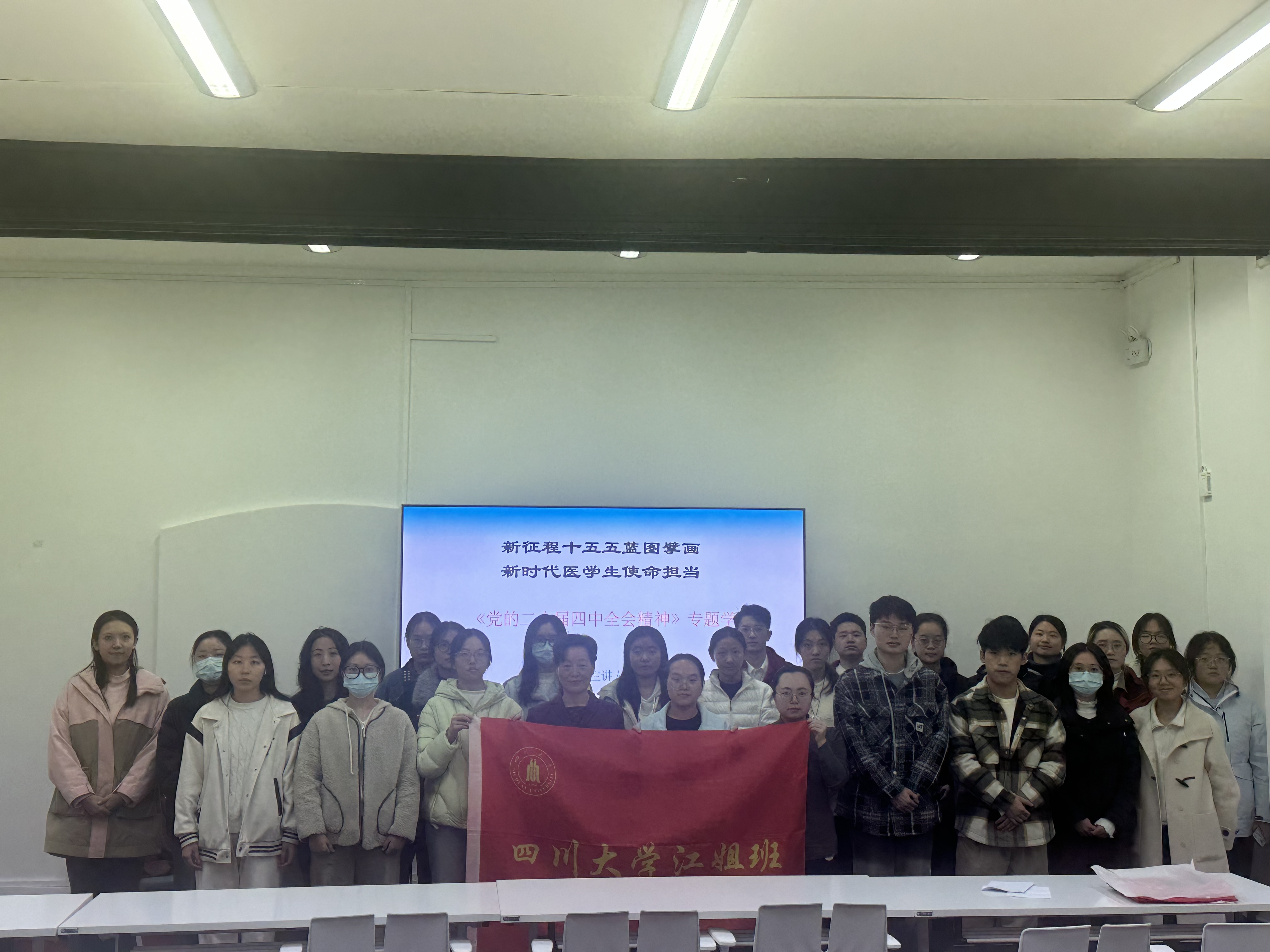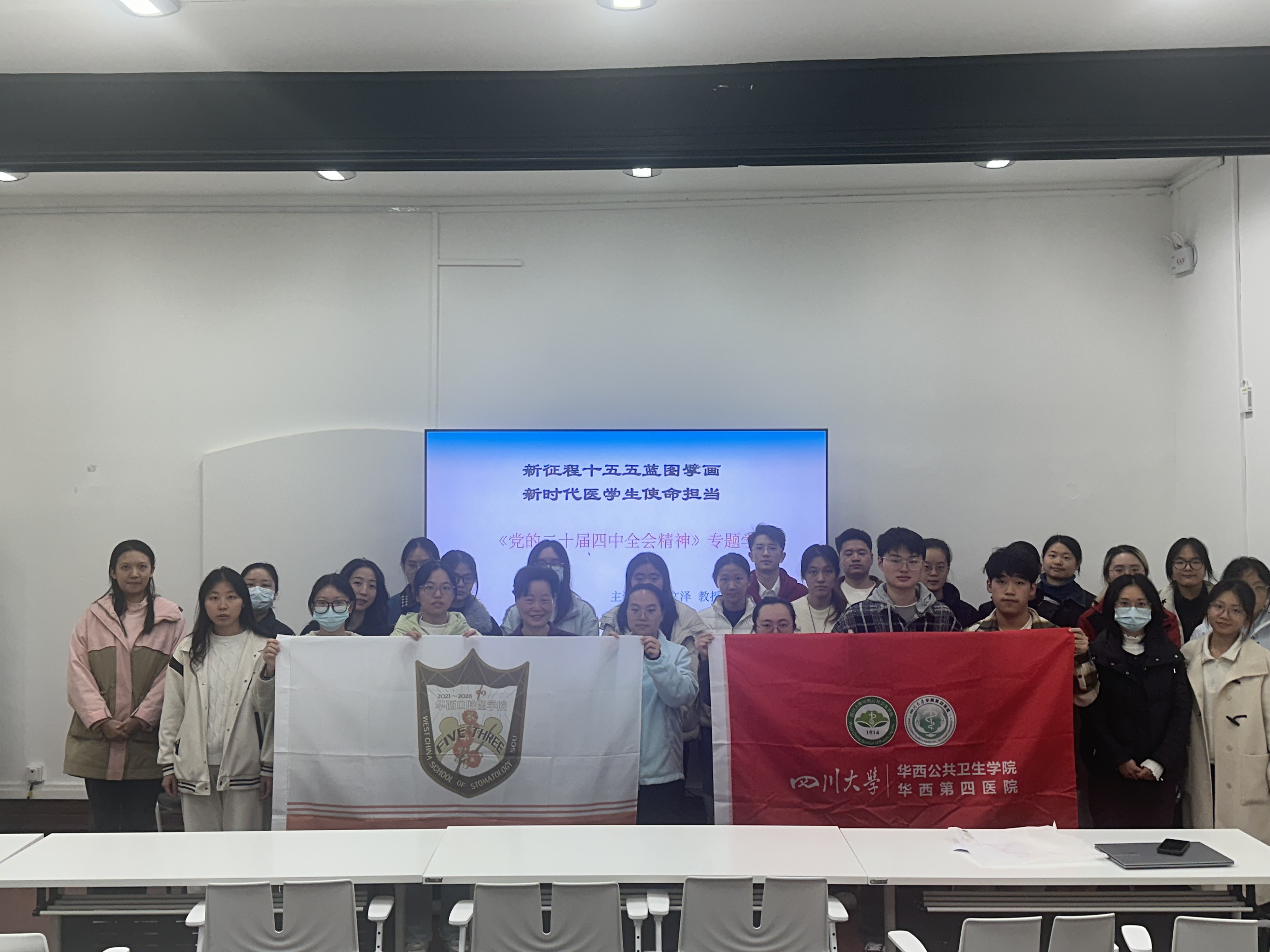 为深入学习贯彻党的二十届四中全会精神,推动口腔医学与预防医学专业学子精准对接 “十五五” 规划战略部署,强化新时代医学生 “大健康” 理念下的使命担当,11月 28 日,华西口腔医学院 2021 级江姐班(口腔医学专业2021级三班)联合华西公共卫生学院江姐班(2022 级预防医学专业二合班)学生代表齐聚四川大学华西校区第四教学楼202开展专题学习活动。活动特邀江姐班教导员、马克思主义学院陈文泽教授作《党的二十届四中全会精神》专题学习授课,两班全体同学通过线下和线上相结合的方式全程参与。