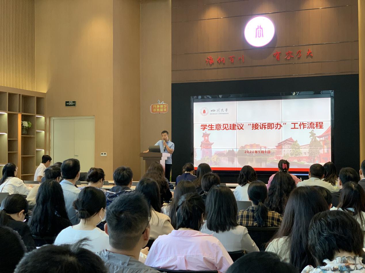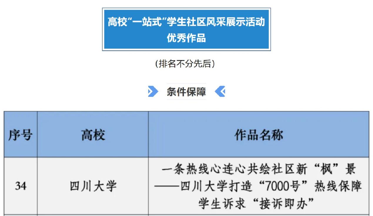 四川大学以习近平新时代中国特色社会主义思想为指导,深入学习贯彻习近平总书记在全国教育大会上的重要讲话精神,紧紧围绕立德树人根本任务,牢牢把握“以学生为中心”的“一站式”学生社区建设理念,将“7000号”热线作为密切联系学生的“第一窗口”,构建“全时响应、精准办理、协同育人”的学生诉求服务体系,让热线成为传递关怀的“暖心线”、解决问题的“高效线”、价值引领的“成长线”,书写新时代高校“枫桥经验”的生动篇章。