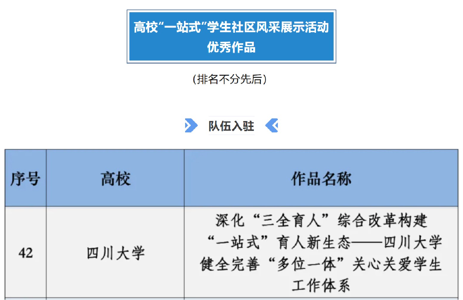 近日,教育部思想政治工作司公布2025年度全国高校“一站式”学生社区风采展示活动优秀成果名单。经高校推荐、专家评审等环节,四川大学推荐报送的4项成果分别入选“队伍入驻”“文化建设”“数字赋能”“条件保障”版块优秀成果。四川大学已连续三年共10项作品入榜高校“一站式”学生社区风采展示优秀成果,不断刷新“川大”范式学生社区“成绩单”。现将本年度入选作品展示如下。
