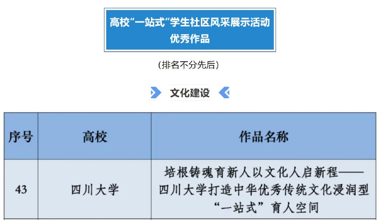 近日,教育部思想政治工作司公布2025年度全国高校“一站式”学生社区风采展示活动优秀成果名单。经高校推荐、专家评审等环节,四川大学推荐报送的4项成果分别入选“队伍入驻”“文化建设”“数字赋能”“条件保障”版块优秀成果。四川大学已连续三年共10项作品入榜高校“一站式”学生社区风采展示优秀成果,不断刷新“川大”范式学生社区“成绩单”。现将本年度入选作品展示如下。